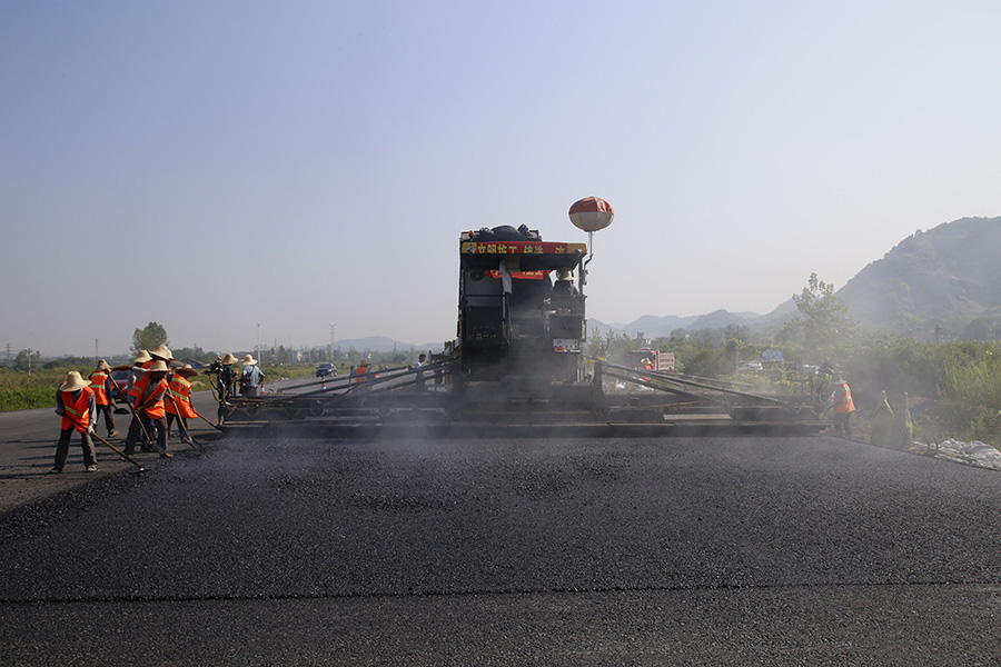 2019年8月,宜春經(jīng)開區(qū)S311路面攤鋪現(xiàn)場,工友們輔助路面兩側(cè)的分料、補(bǔ)窩等作業(yè)